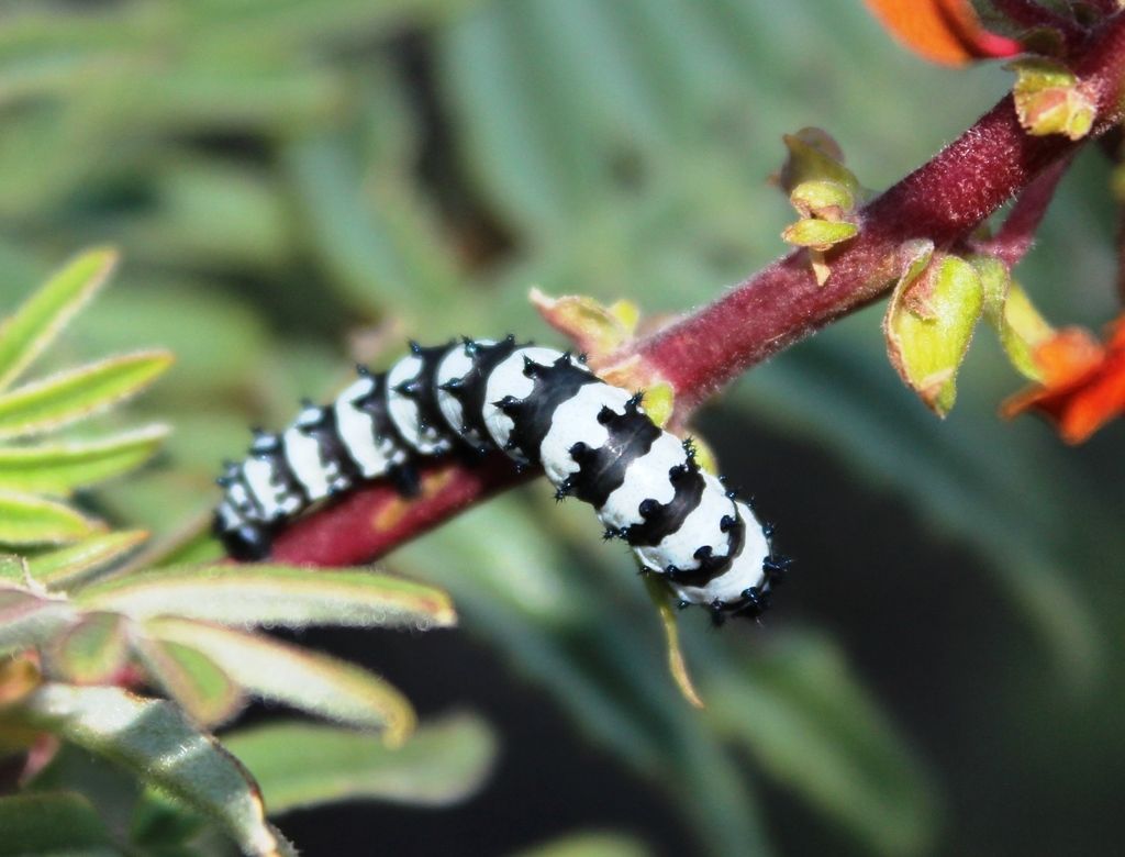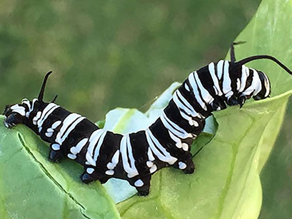 Zebra long winged caterpillars are white with black dots, stripes and soft black spikes. The larvae often feeds on passion vines, the host plant imparts noxious chemicals to the larvae which carry over to the adult butterflies. The relationship with the host plant is a strategic defense, predators find these chemicals distasteful and avoid eating both the larvae and adult butterflies. Although unpalatable to their predators, Zebra longwing caterpillars are harmless to humans. https://en.wikipedia.org/wiki/Heliconius_charithonia