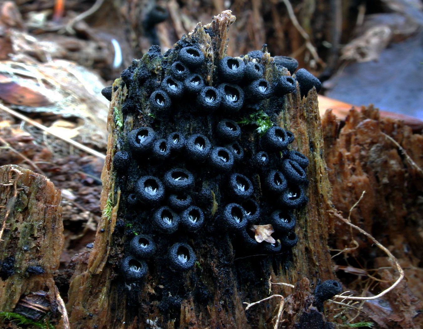 Xylaria polymorpha is a saprotrophic fungus, that grows on dead or dying wood. Typically found near rotting or injured tree stumps, the fungus decomposes the wood and breaks organic matter down where it can be absorbed as nutrients by surrounding plants. Each finger serves as a reproductive vessel for the fungus with a small hole at the top that releases reproductive spores.