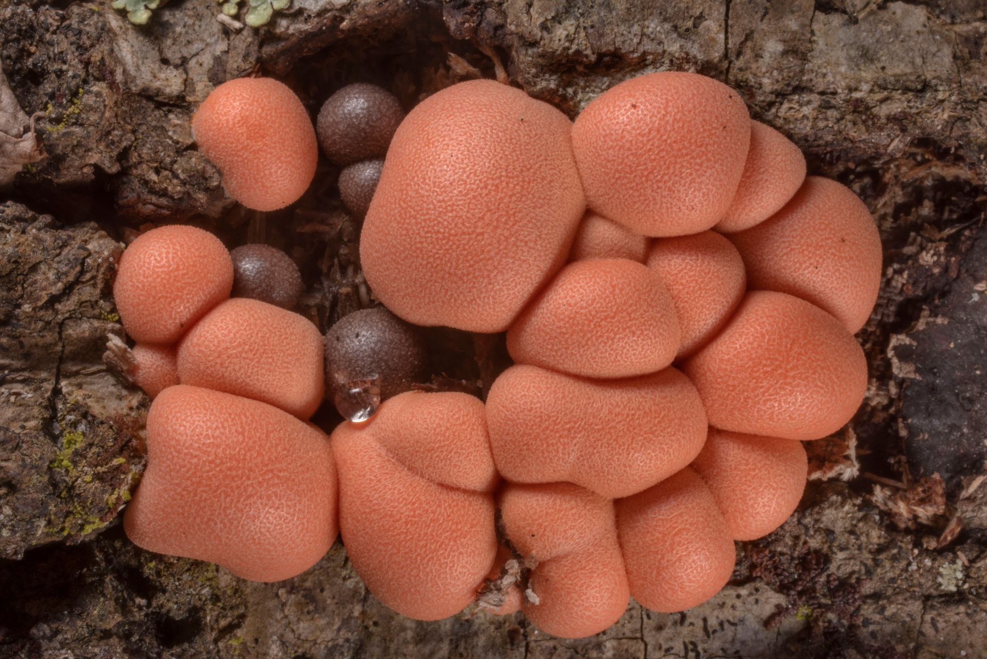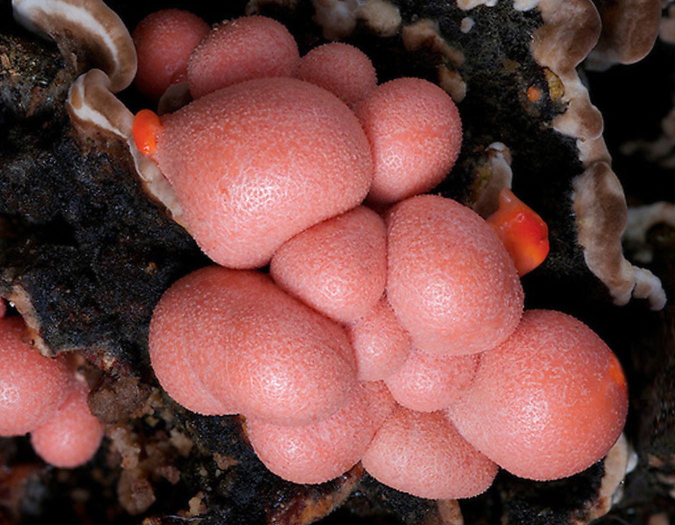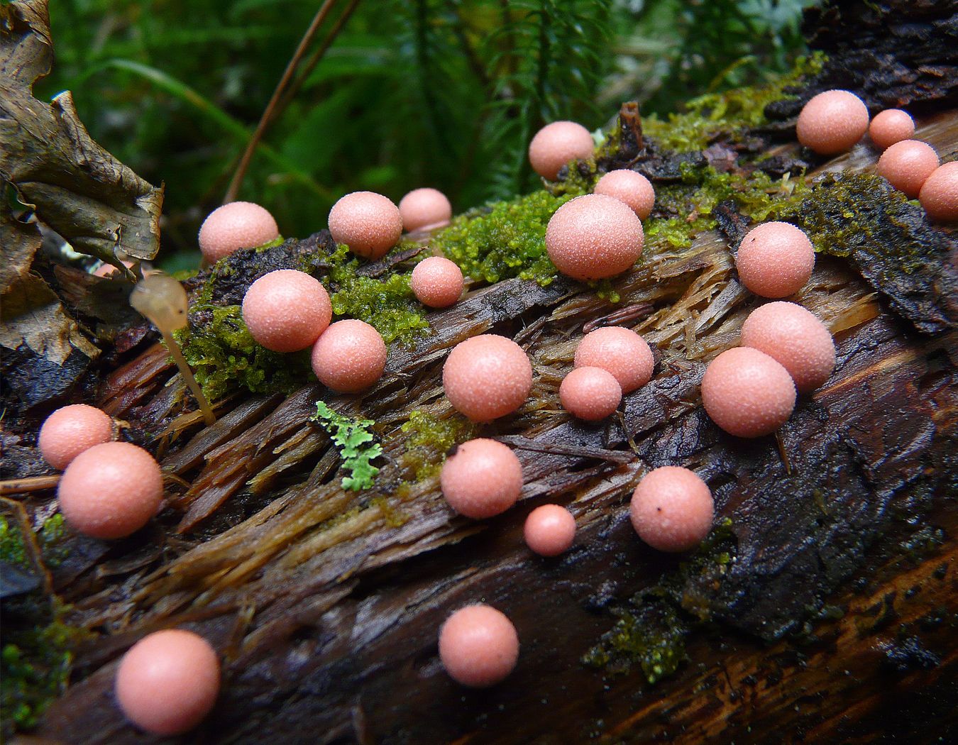 Slime molds are a curious species that shows characteristics associated with both animals and fungi. They're a unicellular organism capable of movement, gradually working their way around rotting substrates consuming bacterial and fungal spores. With suitable conditions, these unicellular individuals aggregate to form fruiting bodies that release spores to become the next generation. Poke one of the fresh limps with a stick and you will quickly discover something: It is filled with sticky goo known as 'wolf's milk'.
