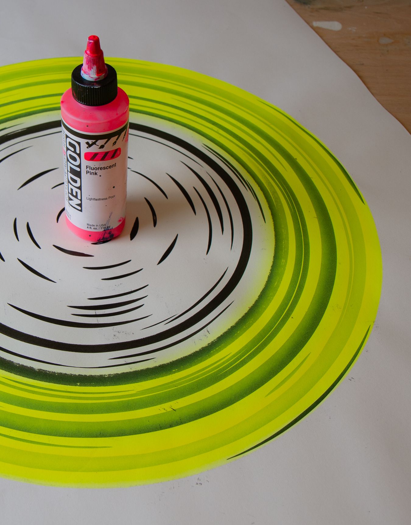 The constant movement of the paper as the paint is applied gives the work a sense of motion, the process creates irregularities, distorted layers and faded color gradients. There is sense of movement and freedom yet this irregularity is bound by the formality of the circle.